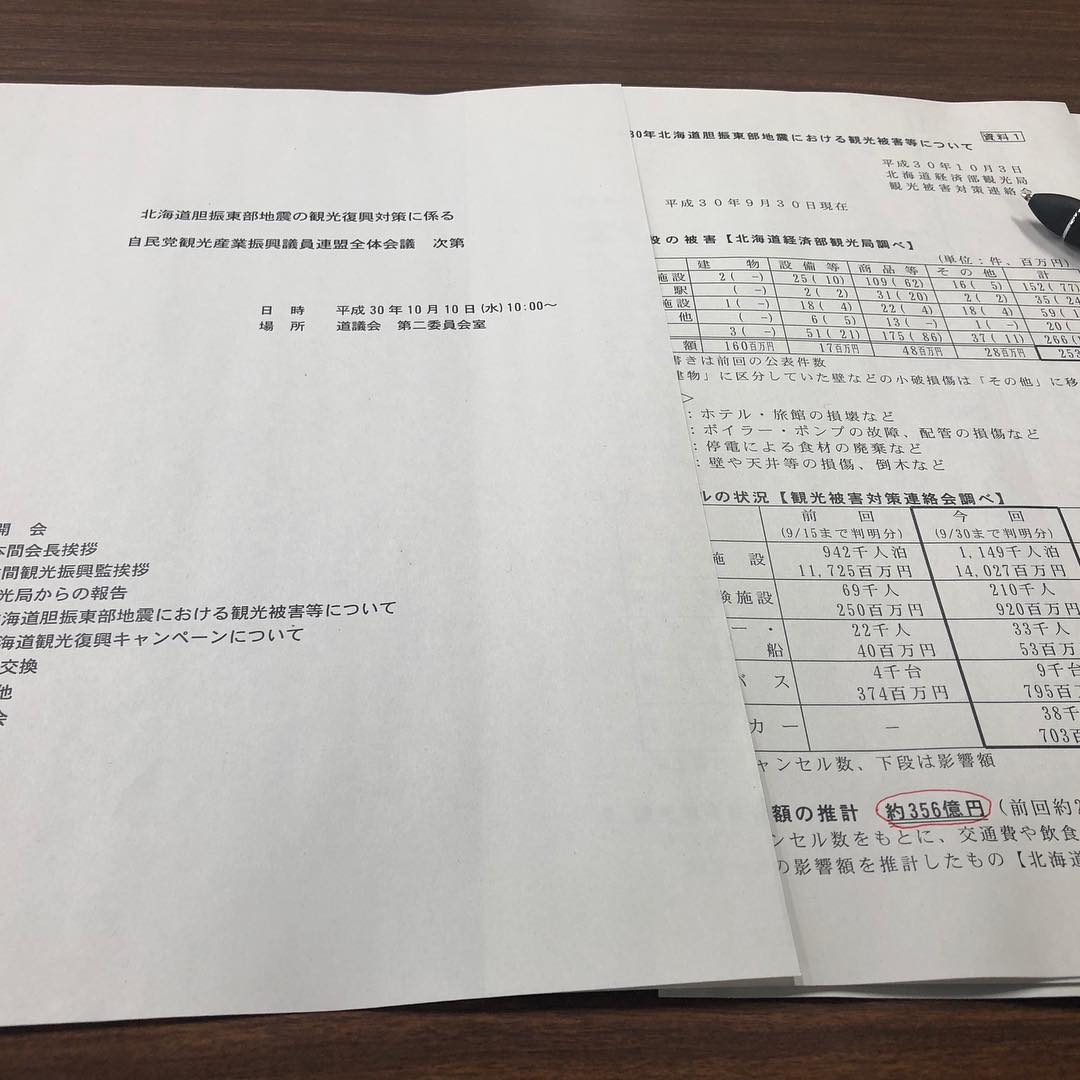 10月10日.2018 本日10時から観光産業振興議員連盟の全体会議でした。 北海道胆振東部地震における観光被害は宿泊キャンセル数をもとに、交通費や飲食、土産物消費などを含めた観光消費の影響額は推計で356億円となっております。 観光産業を基幹 […]