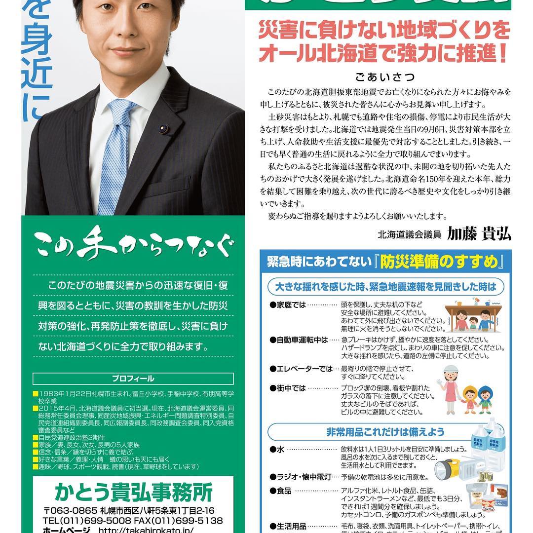 9月28日.2018 第12号の道政だよりが出来ましたので、また配布をさせて頂きます。 ご協力頂いた皆様、これからご協力頂く皆様ありがとうございます! #道政だより #北海道議会議員 #この手からつなぐ #かとう貴弘