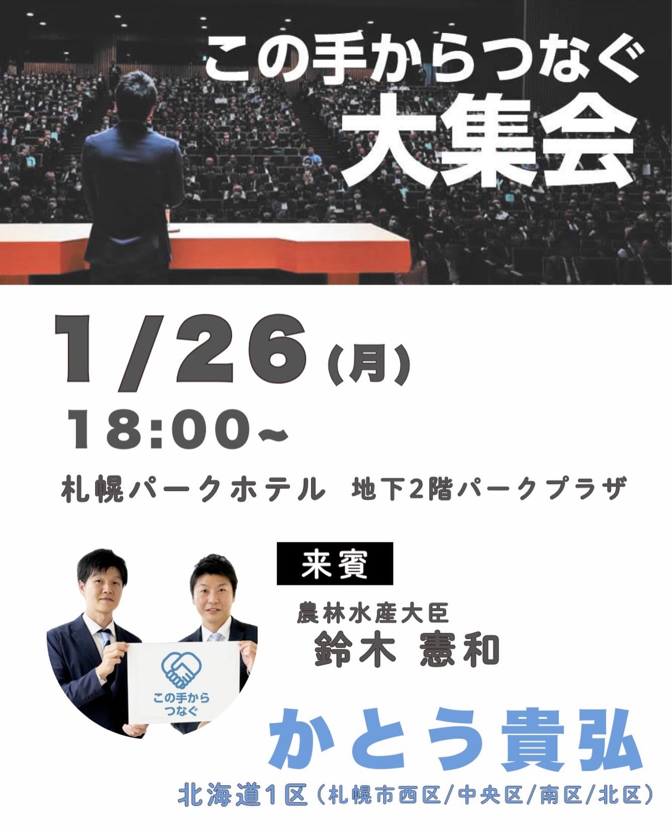 1月18日.2026 【この手からつなぐ大集会】 1/26(月)18:00〜、鈴木憲和 農林水産大臣にお越しいただき、「この手からつなぐ大集会」を行います。 皆さまお誘い合わせの上、ご出席いただき、激励賜りますよう、お願い申し上げます。 #かとう貴弘 #加藤貴弘 #北海道1区 #北海道一区 https://www.instagram.com/p/DTo9j2YDwBM/embed/ 次のページ » ブログトップに戻る