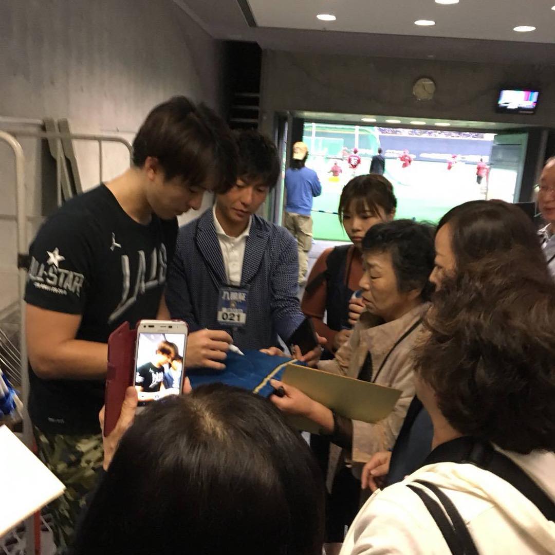 田中賢介さんのご厚意で練習見学をさせて頂き、中島君、上沢君が練習の合間で来てくれました。