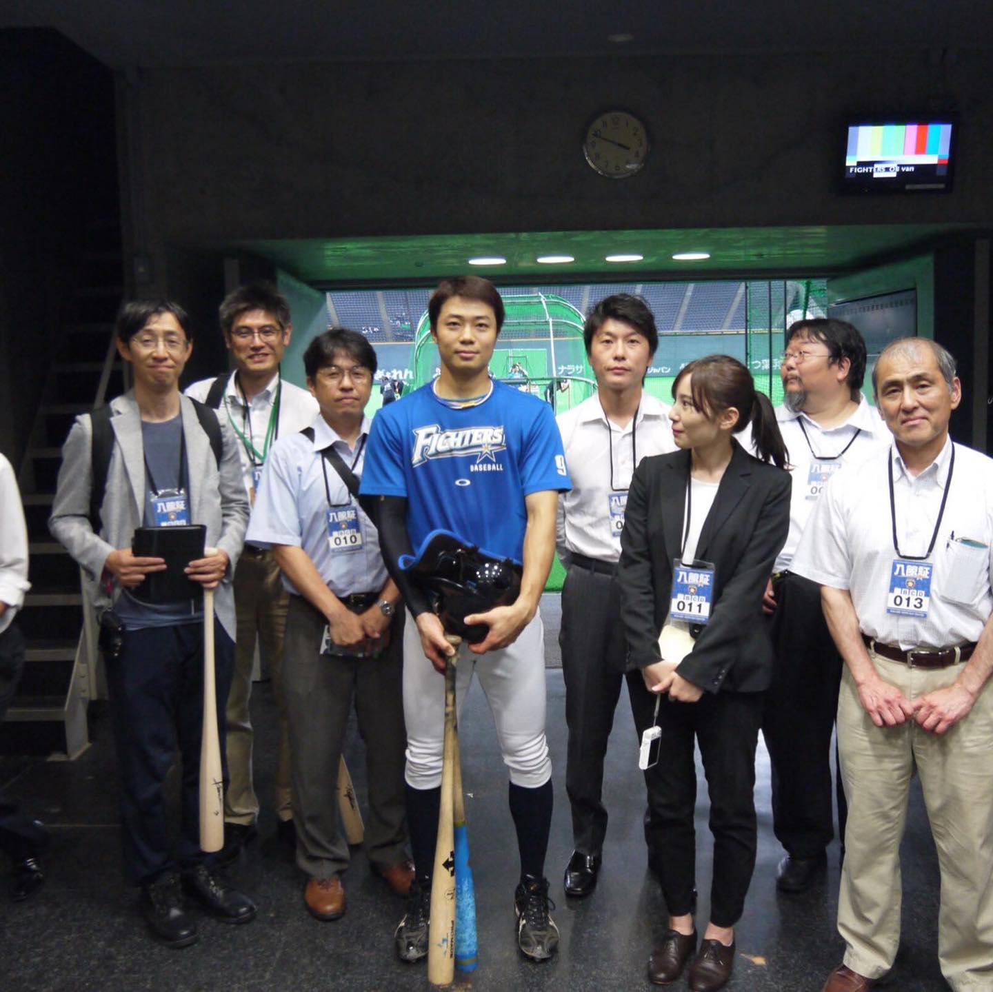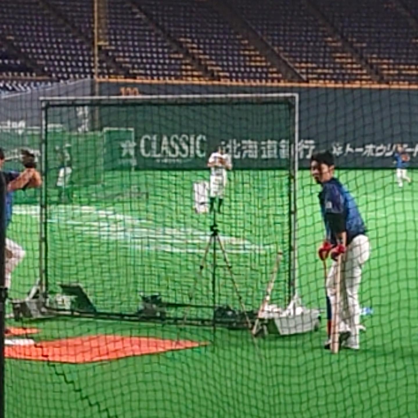 選挙前から言っていた、北海道にある「ダケカンバ」という木をバットにしてプロ野球で使用してもらうというプロジェクトのスタートとして、田中賢介さんにバットを贈呈し、試合前の打撃練習で打っていただきました。