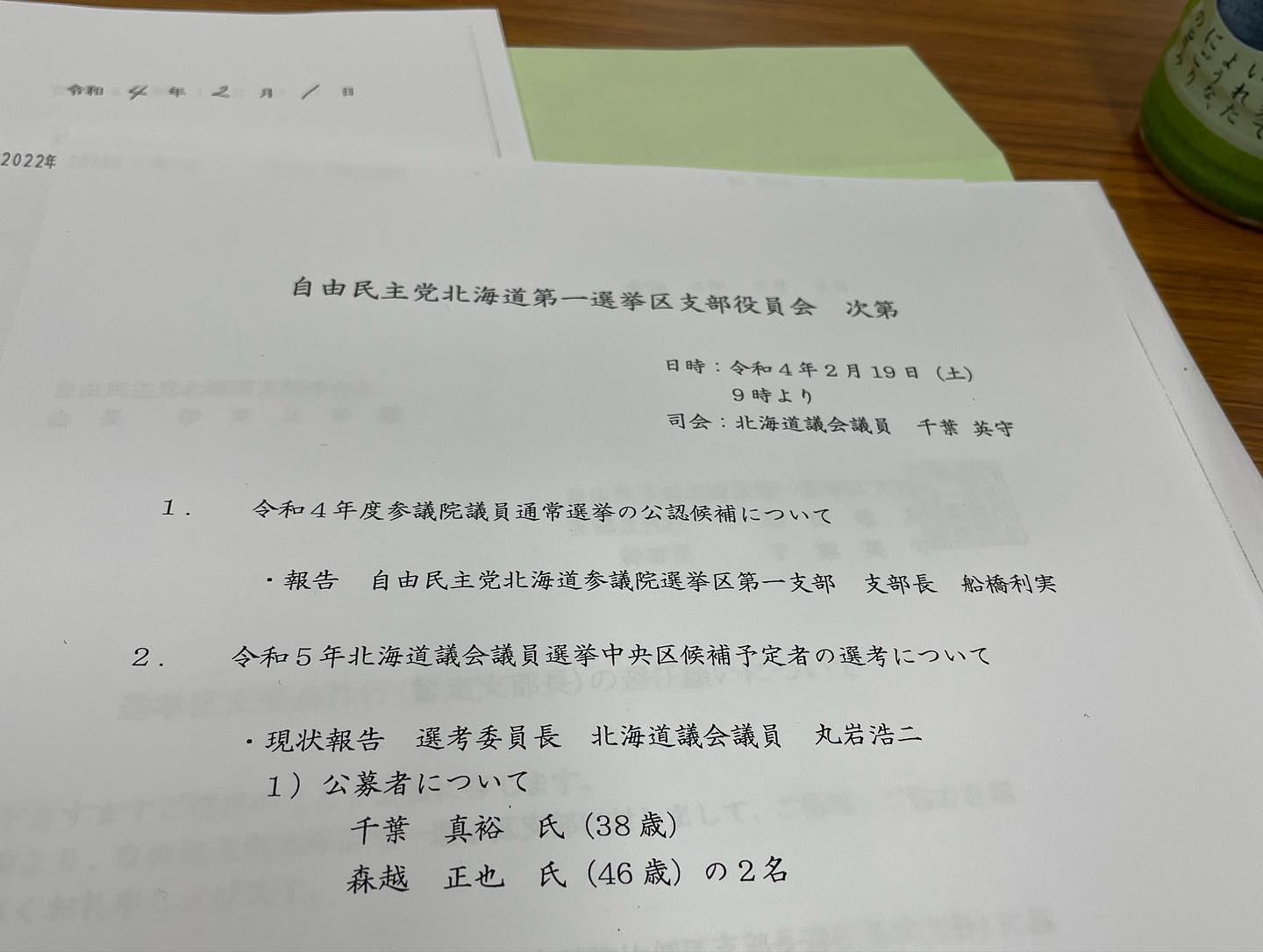 今年行われる参議院選挙の我が党の2人目の候補予定者の船橋利実先生のご報告、そして来春行われる統一地方選挙の中央区道議候補選考について、1区内の市議会議員の公認申請について、そして今後の1区支部長についてでした。