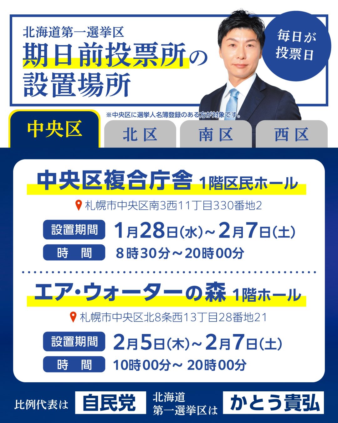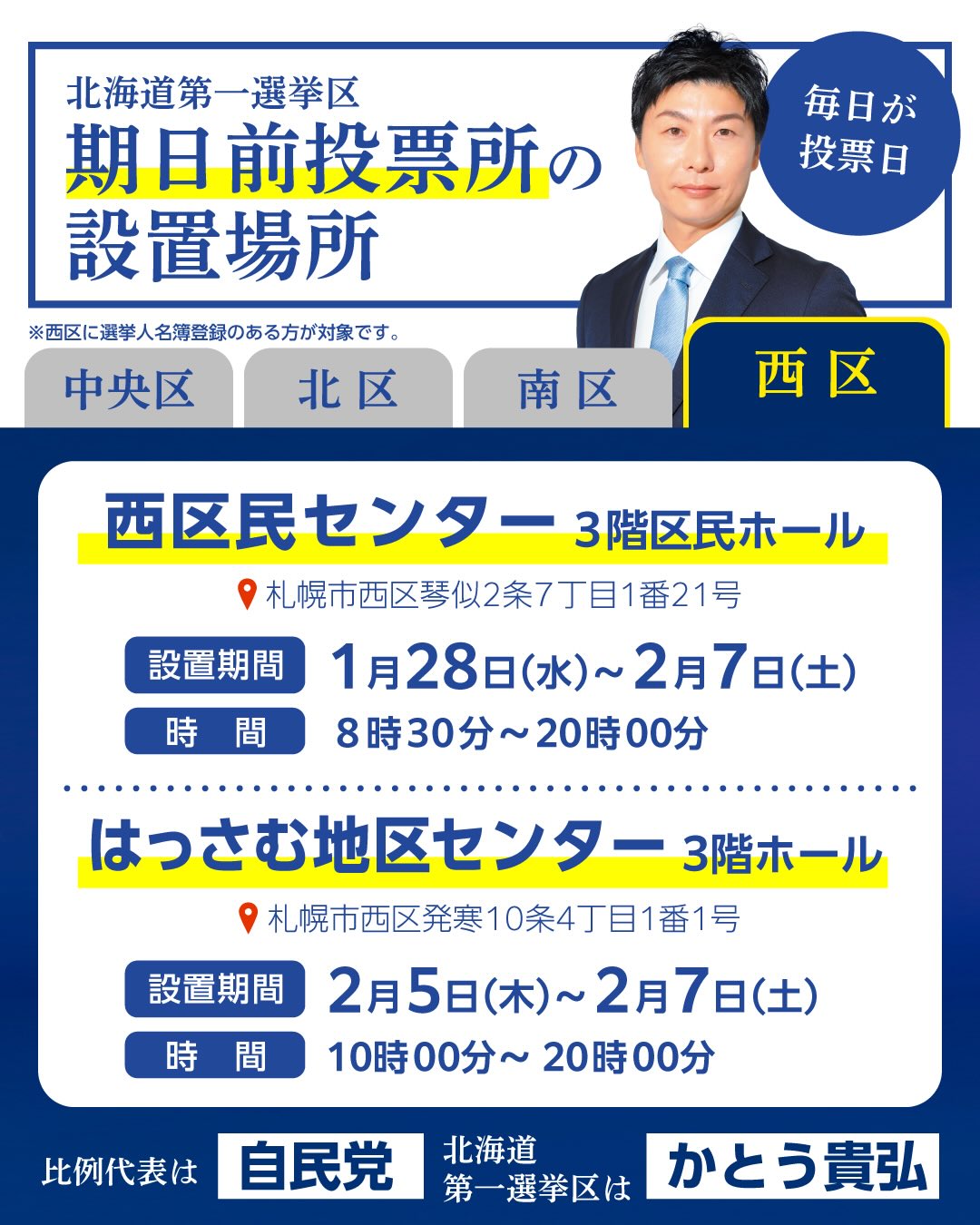 1月28日.2026 期日前投票は1月28日から2月7日までいつでも行えます。第一選挙区の投票所をご案内いたしますので、早めの投票をお願いいたします。 個人名はかとう貴弘、政党名は自民党で宜しくお願いいたします。 #期日前投票 #かとう貴弘 #北海道第一選挙区 https://www.instagram.com/p/DUCoPTyDxOK/embed/ « 前のページ 次のページ » ブログトップに戻る