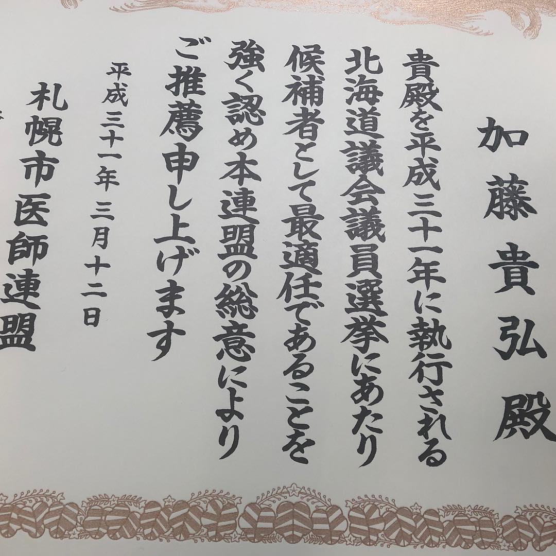 3月13日.2019 おはようございます。 昨夜は発寒南駅で夕方のご挨拶をしてから、医師会館へ向かい、札幌市医師連盟から推薦状を頂きました。 今日も感謝を忘れずに行ってきます️ https://www.instagram.com/p/Bu68 […]