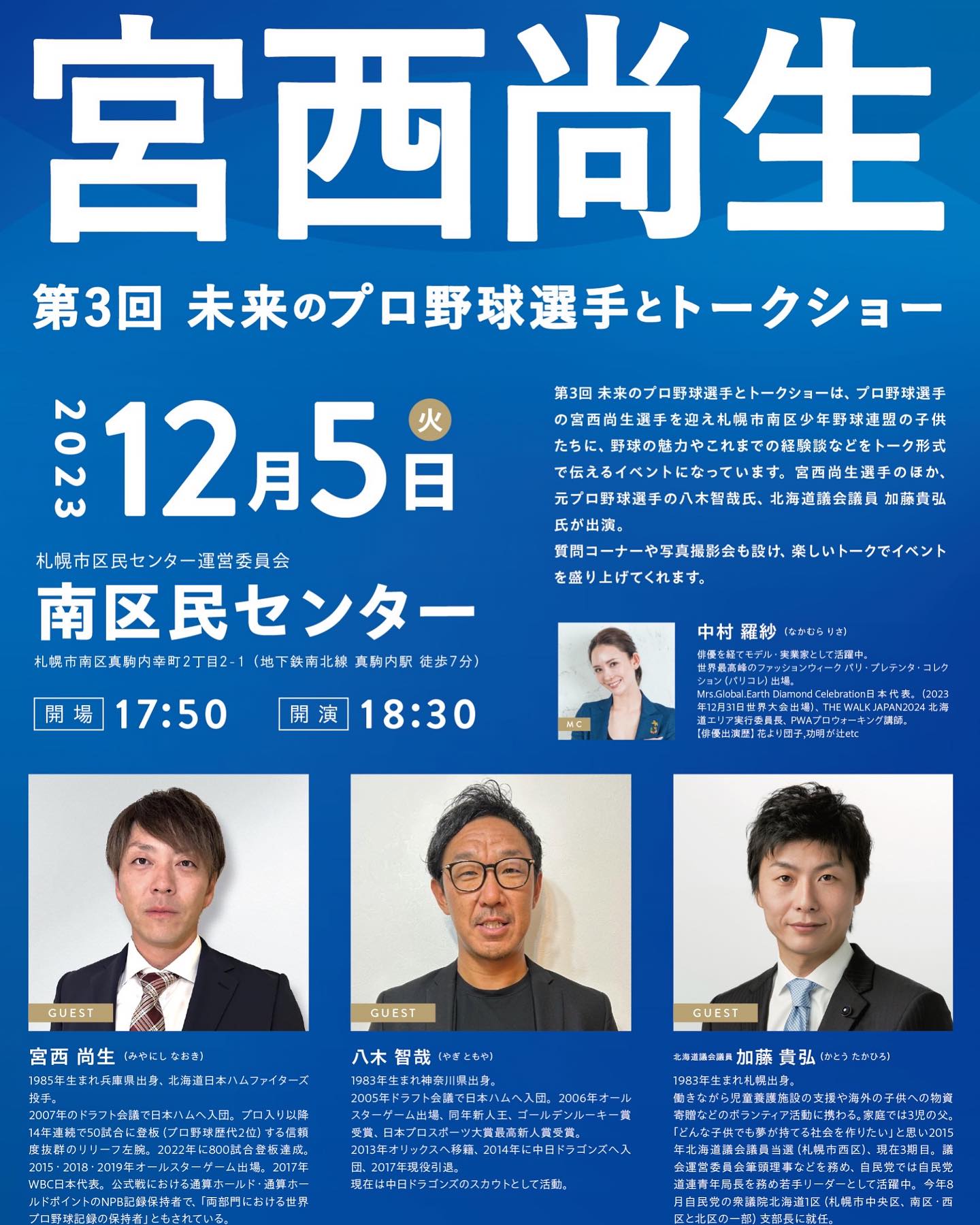 11月11日.2023 【告知】 宮西尚生君と八木智哉君とのトークショーを開催されます。 子供達に少しでも刺激を、 与えられるように頑張ります。 お問い合わせは写真の下記にあります。 #宮西尚生 #八木智哉 #中村羅紗 #札幌市南区 #南区民セ […]