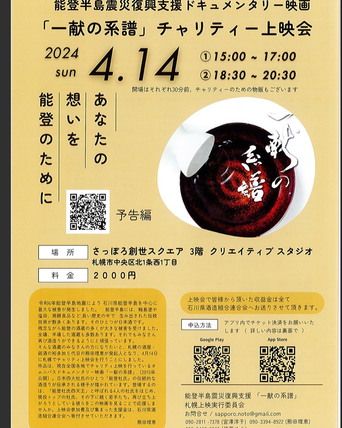4月14日.2024 上映会に行ってきました。 杜氏の一献にかける想い そして能登の復興復旧へ、北の大地からも送りたい。 #一献の系譜 #杜氏 #上映会 #ご縁をありがとうございます #能登の復興 #石川の酒 https://www.inst […]