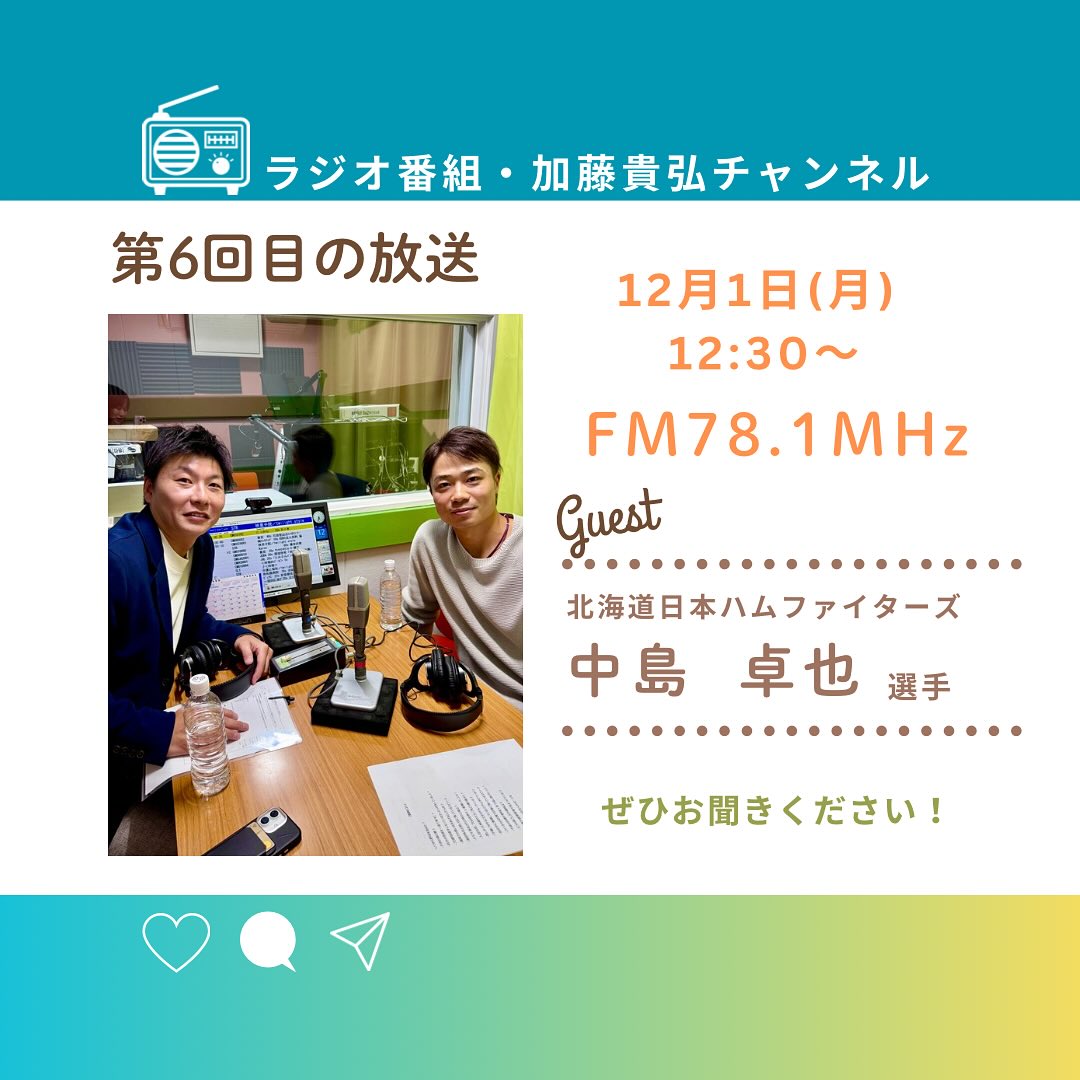 11月21日.2025 \ラジオ・第6回目放送のお知らせ/ 12/1(月) 昼12:30〜 ラジオ番組「加藤貴弘チャンネル」を 放送します! 第6回目のゲストは、 北海道日本ハムファイターズの中島卓也選手です。 プロの世界に入る前のことや、入っ […]
