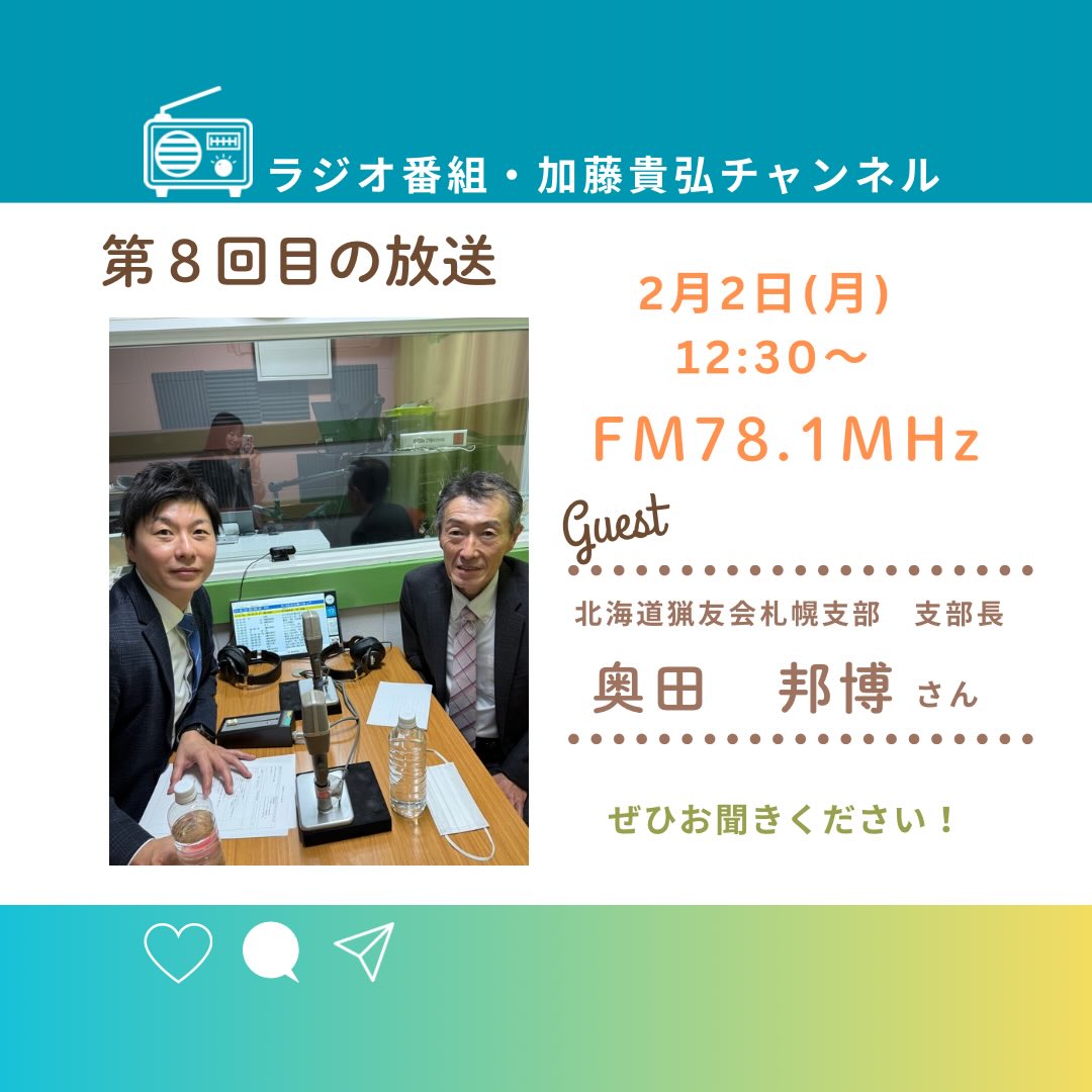 2月1日.2026 \ラジオ・第8回目放送のお知らせ/ 2/2(月) 昼12:30〜 ラジオ番組「加藤貴弘チャンネル」を 放送します! 第8回目のゲストは、 北海道猟友会札幌支部の支部長、奥田邦博さんです。 奥田さんのこれまでの歩みや、近年 […]